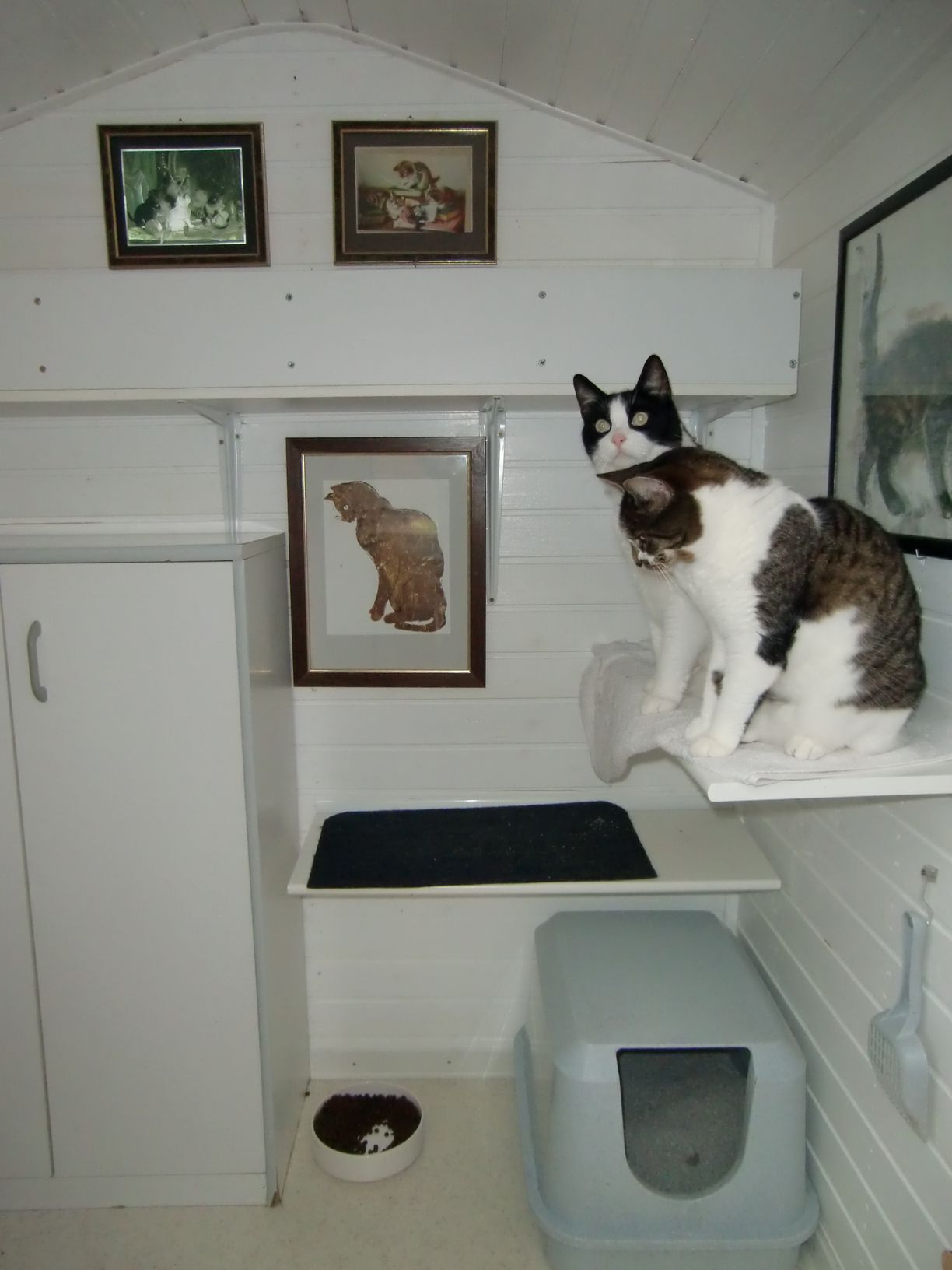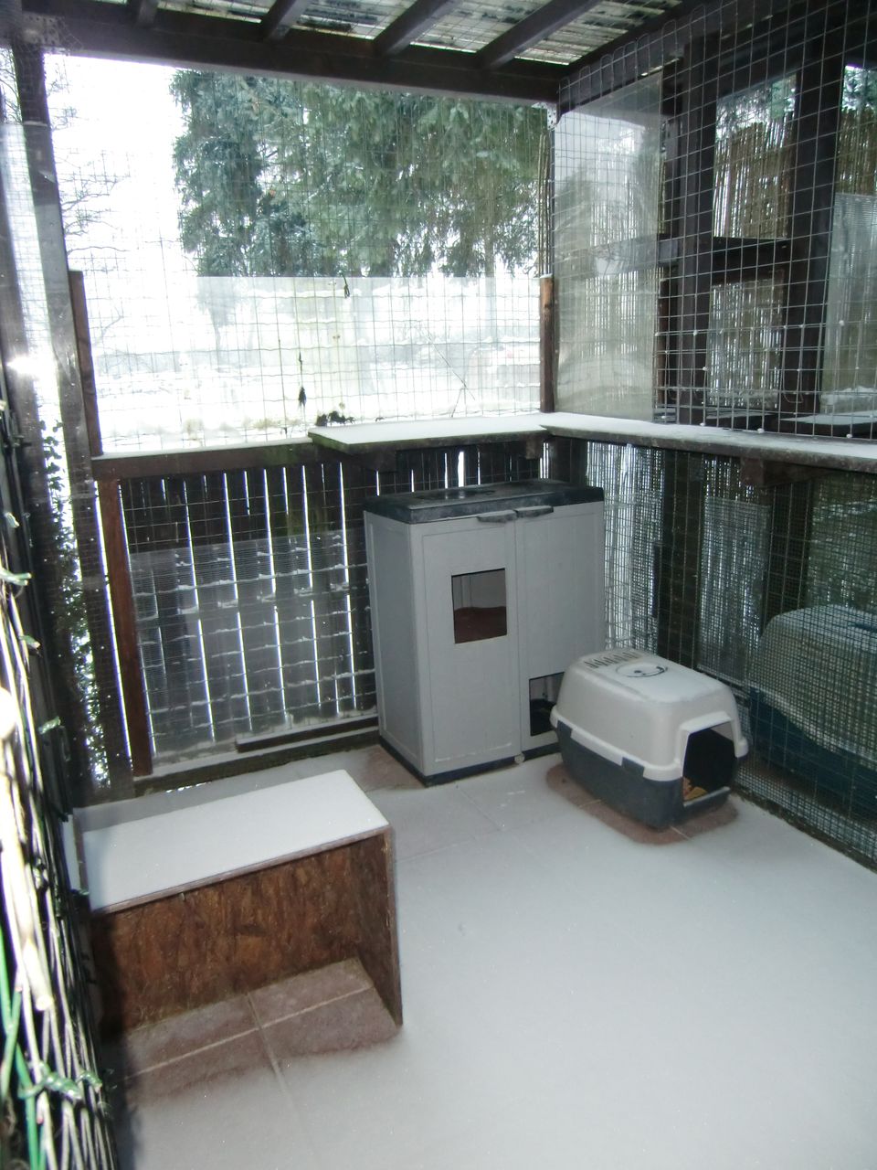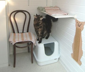 Haus 2 ... hat mindestens vier Liegeebenen, zwischen denen sich die Katzen ihren Platz aussuchen können. Auch dieses Haus ist ideal für alte und ruhebedürftige Katzen. Die Vielzahl der Liegeplätze lässt es auch zu, dass nicht nur ein Tier hier Platz findet. Der Auslauf der für das Haus 2 angelegt ist, ist ca. 8 m² groß. |