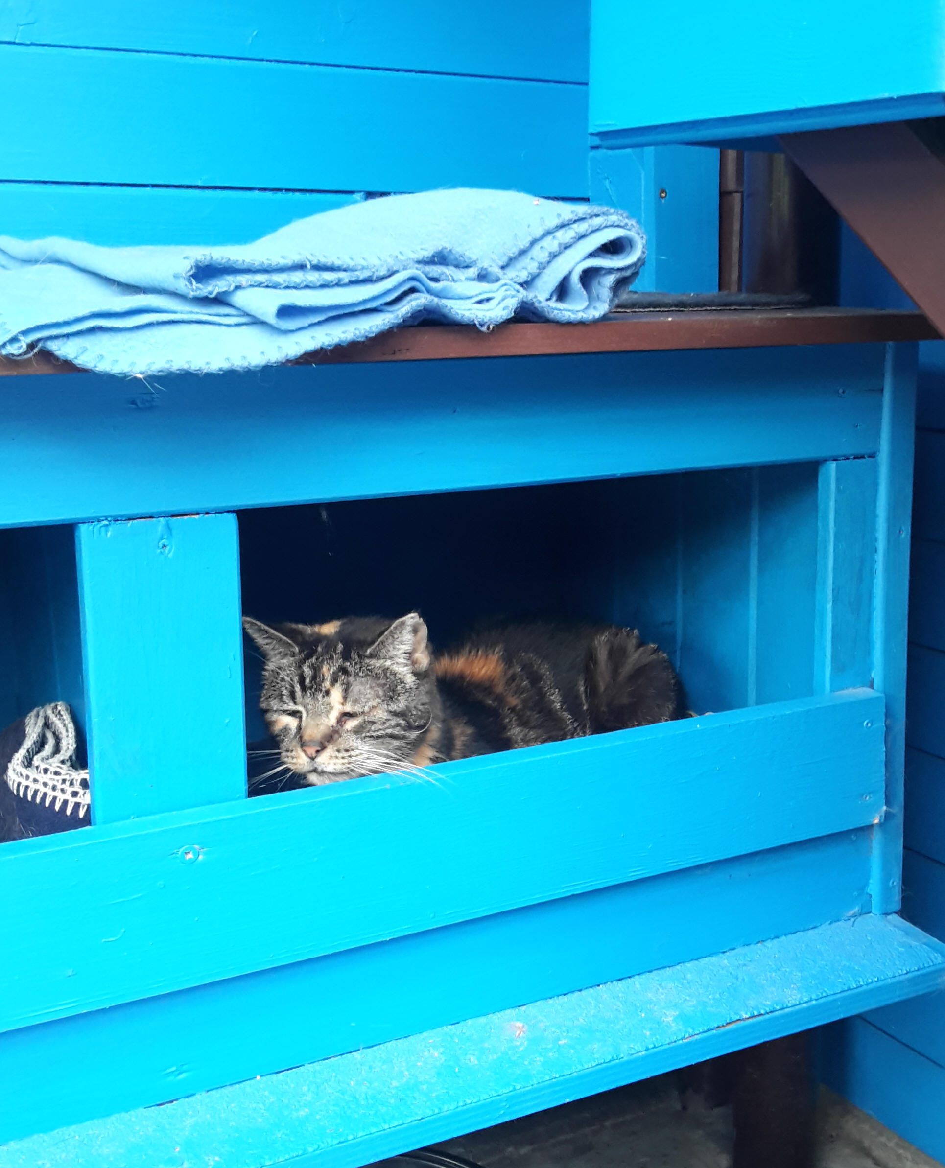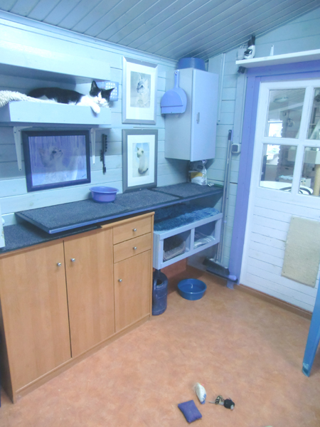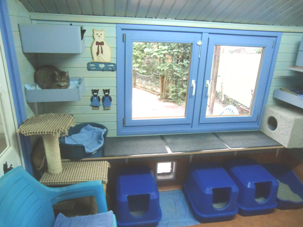 Das blaue Zimmer Auch in diesem Zimmer finden die Tiere in jeder Höhe vielerlei Versteckmöglichkeiten. Eine Katzenklappe führt auch aus diesem Zimmer auf eine grosse Terrasse, die viele Kletter und Unterschlupfmöglichkeiten bietet. |